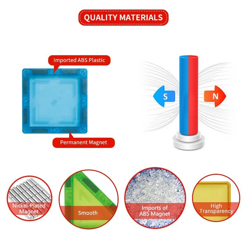 - Matériaux de qualité et sûrs : La sécurité de vos enfants est une priorité pour nous. Nos carreaux magnétiques sont fabriqués à partir de plastique non toxique de haute qualité, durable et sans danger pour les enfants de 3 ans et plus. Tous les bords sont lisses et arrondis pour éviter tout dommage.