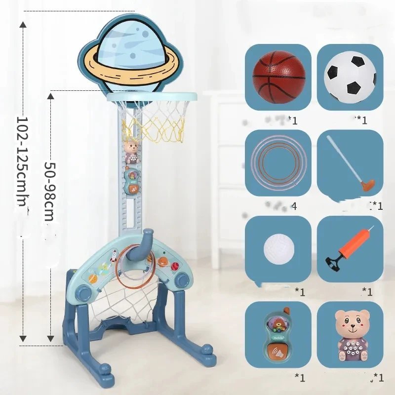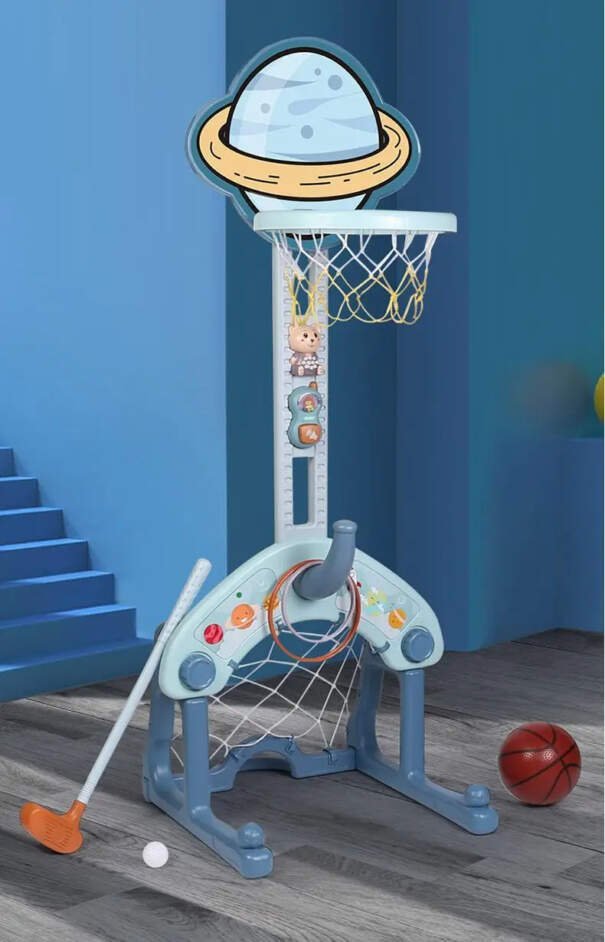 Mots-clés : Centre activités bébé, jouet 4 en 1, basketball enfant, football enfant, golf enfant, lancer anneaux, hauteur ajustable, thème espace, motricité, coordination.