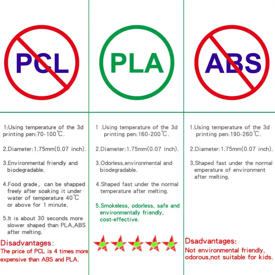 1: Este producto es un consumible para un bolígrafo de impresión 3D, un filamento PLA de color. Sin humo e insípido, seguro y respetuoso con el medio ambiente. El diámetro es de 1,75mm y la temperatura de trabajo debe ser de 160-200 grados Celsius. Confirme si su bolígrafo de impresión se puede utilizar antes de comprar.