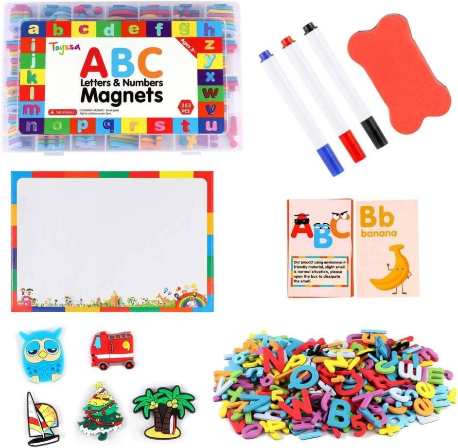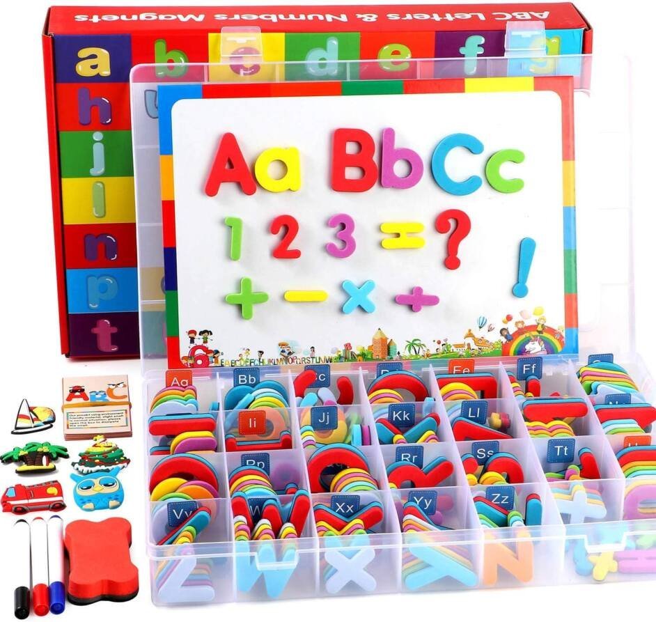 Kit ABC Lettres et Chiffres 253 pièces magnétiques avec Tableau magnétique double face et rangement