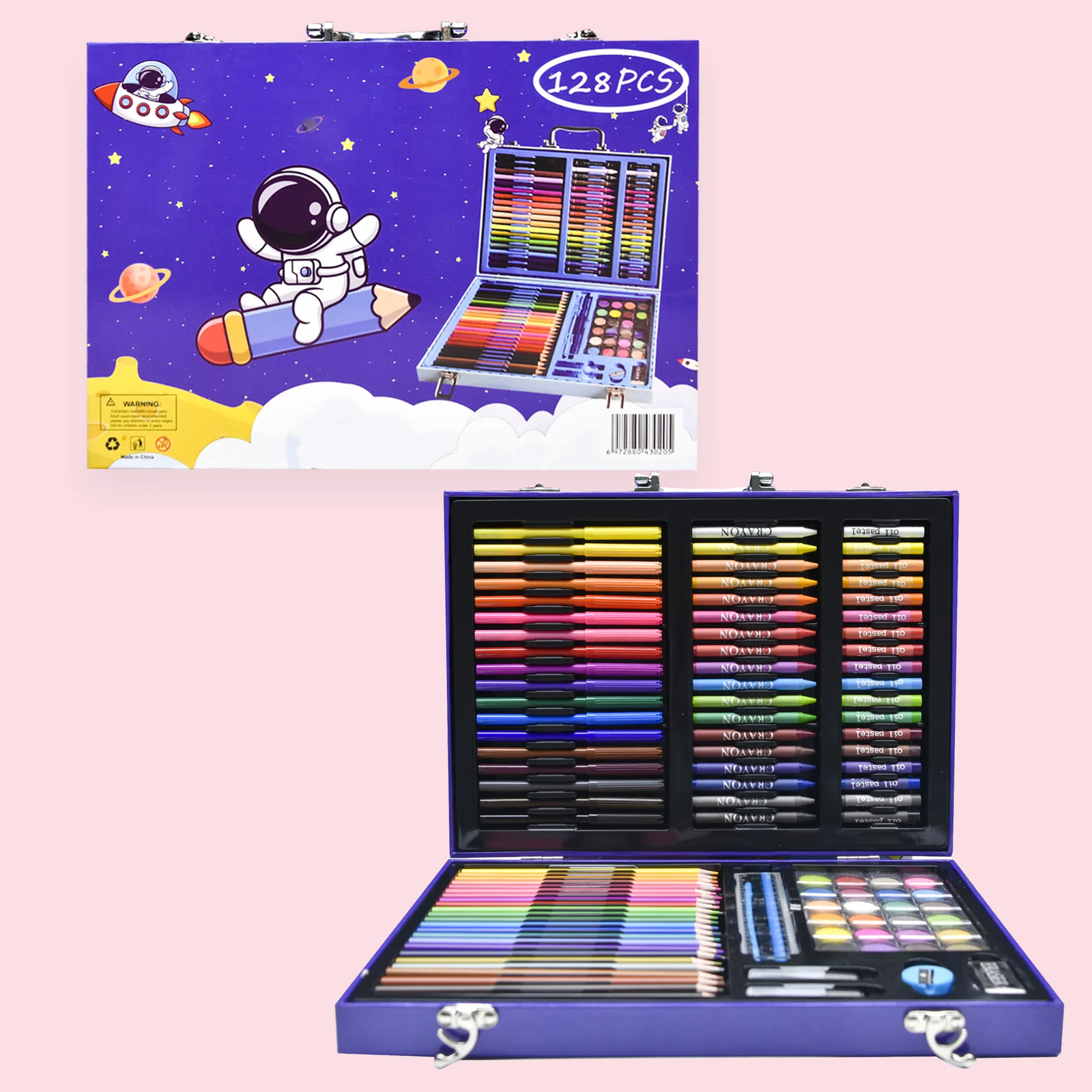 Contenu riche: L’ensemble comprend 14 crayons de couleur, 26 stylos à aquarelle fine, 20 stylos à aquarelle brute, 20 crayons, 20 pastels à l’huile, 15 poudres pressées de couleur, 1 taille-crayon, 1 règle, 1 stylo de traçage, 1 crayon HB, 1 gomme, 1 palette, 1 bouteille de colle, 5 trombones.