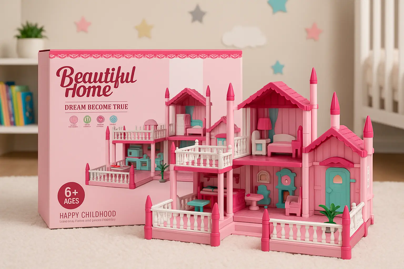 Tags : maison poupée, jouet fille 6 ans, maison miniature, jouet d’imitation, villa poupée, maison rose, jeu enfant fille, happy childhood, maison de rêve