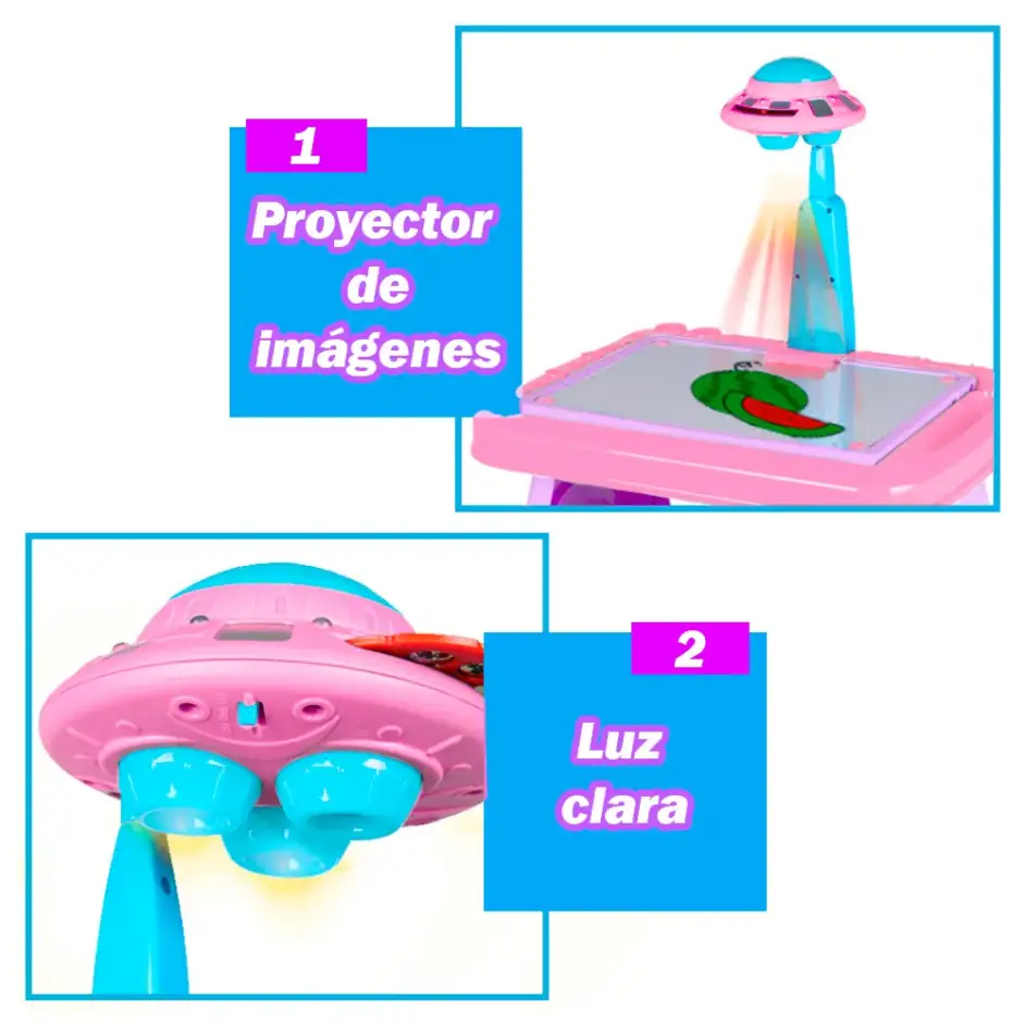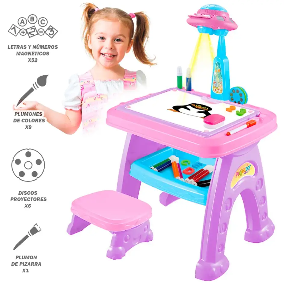 Offrez à vos petits des heures de plaisir et de divertissement sain, tout en stimulant leur développement et leur créativité. Cet ensemble de planche à dessin éducative avec projecteur comprend un tabouret pour rendre les enfants plus à l’aise. De plus, le bureau pour enfants dispose d’un plateau pour ranger les accessoires. Le projecteur a tout ce dont vous avez besoin, y compris 6 disques avec 8 dessins chacun. Placez simplement le disque dans le projecteur et l’image est projetée sur la table pour que les enfants puissent la tracer. La planche à dessin peut également être retournée pour créer un plateau de jeu magnétique. Cet outil d’apprentissage est plus qu’un simple jouet, il est idéal pour libérer l’imagination des plus petits.