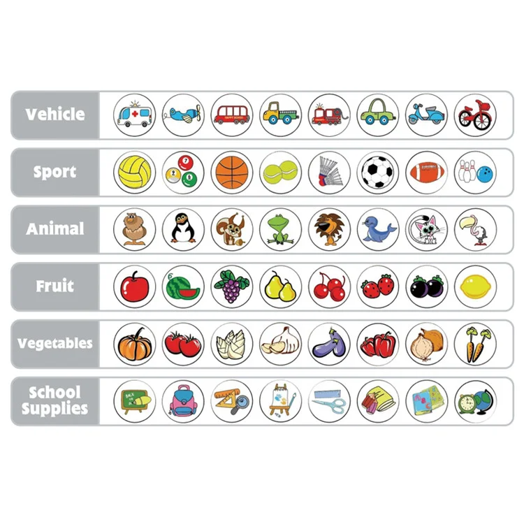 - 6 disques projecteurs (fruits, légumes, sports, animaux, transport, fournitures scolaires) avec 8 motifs chacun, 48 images différentes au total.